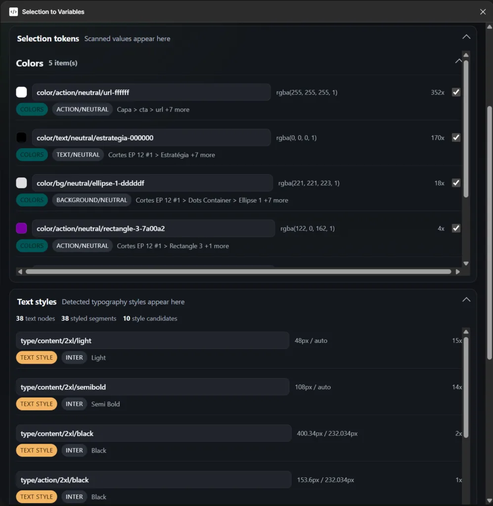 Quando o plugin começou a listar todos os valores encontrados na interface, surgiu um novo problema. Havia informação demais. Nem todo valor encontrado no arquivo merece virar token ou variável. Muitos valores aparecem apenas uma vez, outros são resultado de decisões pontuais.