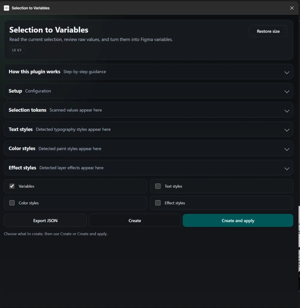 Outra melhoria importante surgiu depois. No Figma, variáveis e estilos são sistemas diferentes. Muitas vezes eles acabam sendo usados de forma separada, mas existe um benefício claro em conectá-los. Sempre que possível, o plugin passou a permitir que estilos reutilizassem variáveis compatíveis. Isso significa que um estilo pode usar valores que já existem como variáveis. Esse pequeno detalhe ajuda a criar uma estrutura mais coerente dentro do arquivo.
